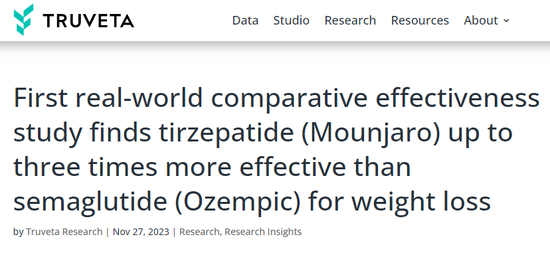 当地时间周一(11月27日),美国电子健康档案(EHR)数据和分析公司Truveta发布报告表示,根据其研究结果,礼来替尔泊肽(Tirzepatide)的减肥效果是诺和诺德司美格鲁肽(Semaglutide)的三倍。
