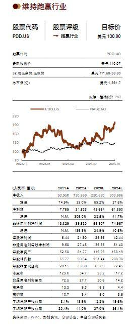 拼多多目前交易于2023年和2024年非通用准则市盈率21倍和14倍。中金上调今年和2024年收入预测4%和6%至2208亿元和3039亿元,得益于Temu收入优异表现;上调今年非通用准则归母净利润3%至533亿元,维持2024年非通用准则归母净利润基本不变,主要由于主站经营效率改善。