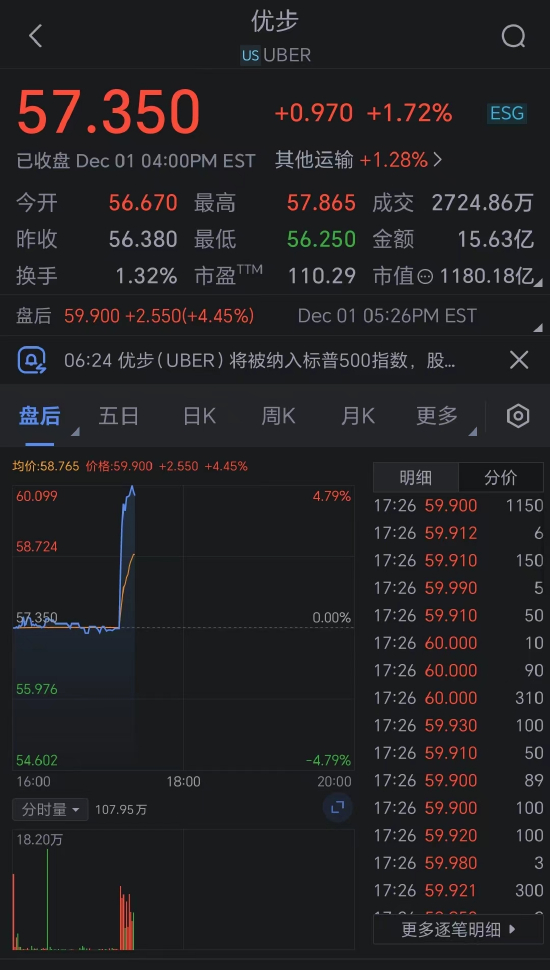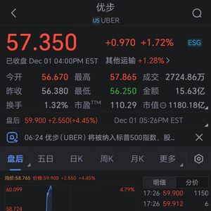 Uber股价在盘后交易中一度上涨6.5%。
