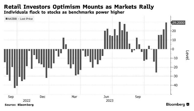 “严格地从逆向投资情绪的角度来看,现在是时候对短期持谨慎态度了,”the book Report作者Peter Boockvar引用美国投资者协会(AAII)最新数据写道,“个人投资者的乐观情绪现在已经到了极点。”