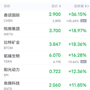 香颂国际涨超36%,悦商集团,比特矿业涨超18%,拓臻生物涨超16%,阳光动力涨超12%,叁腾科技,趣活,比特数字涨超11%,华米,量子之歌涨超9%,知乎,怪兽充电涨超8%,聪链集团,艾斯欧艾斯,易电行,安博教育,箩筐技术,拍明芯城等涨超7%,聚好商城,嘉楠科技,猎豹移动,趣店等涨超6%。