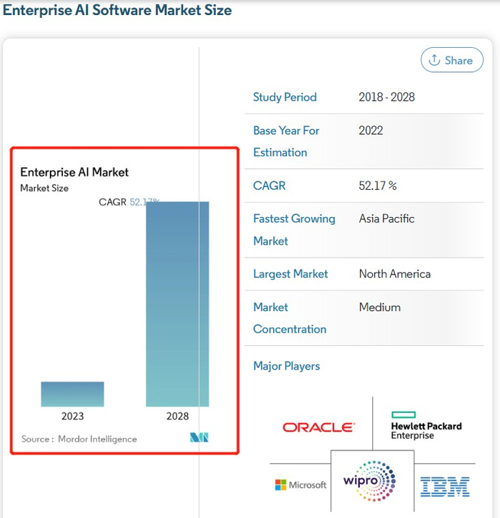 企业AI应用端预期方面,Mordor Intelligence研究报告显示,预计到2028年,企业人工智能市场的总规模将以每年52%的速度快速增长。Mordor Intelligence指出,全球企业逐渐认识到将人工智能融入其业务流程、通过AI自动化流程提高经营效率并降低成本的价值。Mordor Intelligence,最重要的是,AI未来将能够帮助全球企业预测业务成果,提高企业盈利能力。
