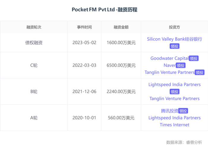 据睿兽分析,Pocket FM成立于2018年9月,共获得多轮投资。