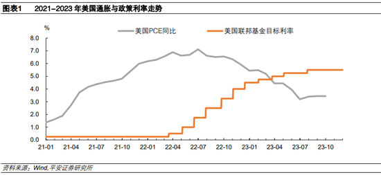 从“通胀是暂时的”到“维护物价稳定”,美联储对通胀的态度演变成为本轮美国利率走势的重要线索。新冠疫情冲击后,美联储采取宽松政策以助力经济复苏。由于预见经济复苏过程中通胀可能阶段“超调”,2020年8月,美联储提出“平均通胀目标制”,为其在通胀高于2%时保持宽松货币政策作铺垫。2021年,美国PCE通胀率自3月超过2%,此后一路上升至年末的6%左右。但是,美联储在11月以前坚称“通胀是暂时的”,维持零利率与量化宽松操作;11月,美联储正式修改“通胀暂时论”,将通胀归因于“与疫情和经济重启相关的供需失衡”,同时开始削减购债(Taper)。2022年,俄乌冲突再为通胀添火,美联储在3月以后的声明中增加了有关地缘风险和能源涨价的表述,同时开启一轮激进的加息周期,曾连续10次加息、其中4次单次加息75个基点,截至2023年11月已累计加息5.25个百分点。