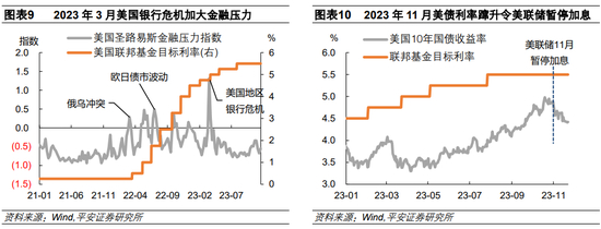 2023年,美联储的政策逻辑逐渐发生变化。年初首次议息会议以来,美联储放缓单次加息节奏至25BP,且在6月、9月和11月“跳过”加息。尽管美联储声称通胀仍然过高,货币政策仍然紧缩,且在必要时还可能采取进一步紧缩的行动;但同时也认为“双向风险”(紧缩过度和紧缩不足的风险)更加平衡,关注力从加息的速度逐渐转移至加息的高度、以及维持高利率的时长。美联储逐步放缓加息,出于多重考量:其一,美国通胀顺利回落,PCE通胀率从2023年1月的5.5%回落至6月的3.2%。其二,3-4月,美国地区银行暴露危机,迫使美联储更加关注紧缩行动带来的金融风险。其三,9-10月,在美国预算悬而未决、财政部融资规模超市场预期等事件下,有关美债供给过度的担忧上升,令美债遭遇抛售、金融条件收紧,美联储在11月会议选择再次暂停加息,以平衡美债利率过快上行的影响。