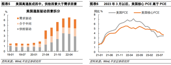 美联储是否应该对高通胀负主要责任?这个问题见仁见智。“物价稳定”是美联储的双目标之一。在开始加息后,鲍威尔多次表达,“物价稳定”是“最大就业”的前提,可以认为美联储阶段性更加重视通胀目标。所以从结果上看,通胀过高,美联储难辞其咎。但如果从成因上看,物价同时由需求和供给决定,而本轮美国高通胀的成因中,供给因素的角色可能更重。据OECD研究,在2022年二季度美国通胀最高的时候,“供给驱动”和“需求驱动”分别拉动标题通胀率3.4和2.0个百分点。2022年下半年以来,美国通胀持续改善,主要得益于供给扰动的退潮。在此期间,需求因素改善并不明显,美国经济增长仍然强劲,实际GDP环比折年率连续五个季度超过2%,失业率保持在4%以内。2023年3月以来,美国核心PCE通胀率开始高于PCE通胀率,与需求更相关的核心服务通胀具有相当粘性。不过,即便仅考虑需求因素,本轮美国需求增长除了货币政策助力外,更离不开大规模财政刺激的加持,美联储或也不应该“负全责”。