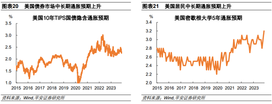 再看通胀水平。在后疫情时代,美国中长期通胀水平可能略高于2%,突破2015-2019年1.5%的波动中枢。需求方面,本轮美国货币和财政刺激实质上践行了现代货币理论(MMT)的思想,通过激进的政策刺激弥补有效需求的不足,有望打破国际金融危机以来美国需求长期不足的瓶颈。供给方面,劳动力短缺、能源转型、国际供应链退化等因素,可能持续较长时间,并减弱供给端的灵活性,增大通胀波动风险。通胀预期方面,通胀的“自我实现”效应也不容忽视,2021年以来美国通胀已经“超调”三年之久,这可能重塑居民消费、企业生产以及政府支出的习惯与逻辑。2023年以来,美国10年TIPS国债隐含通胀预期波动中枢达到2.4%,明显高于2015-2019年平均水平的1.8%;美国密歇根大学针对居民的调查结果显示,2023年以来居民对未来五年的通胀预期在3%左右,明显高于2015-2019年平均水平的2.5%。当下,关于美联储是否应该适当上修2%通胀目标的讨论不断,美联储无疑会在这一问题上谨慎行事,在实操层面追求更灵活的物价目标,对略高于2%的通胀水平给与一定容忍,尽量避免紧缩过度引发不必要的经济衰退。