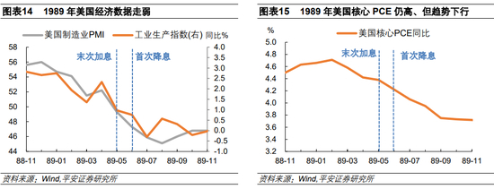 当美国经济尚未衰退但走弱信号增多时,美联储可能选择适当降息以防经济过快降温,即“预防式降息”。1989年、1995年和2019年的首次降息大致符合此类情形,但也有各自的特点。1989年,格林斯潘领导的美联储也在抗击通胀,美国政策利率峰值高达9.81%,但随着新增非农、制造业PMI、工业生产等经济数据走弱,美联储更加相信未来通胀可控,因此于 1989 年 6 月首次降息。1995年,美联储于7月首次降息时,PCE通胀率处于2%附近,但失业率略高于CBO预测的“自然失业率”且出现上行迹象。2019年,美联储于8月首次降息时,尽管失业率仍处于4%以内,但PCE通胀低于2%且出现走弱苗头。