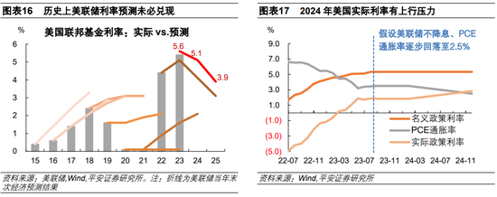 其次,伴随通胀回落美国实际利率水平自然上升,美联储有空间也有必要去调降名义利率,防止实际利率过高。参考美联储预测,假设2024年美国PCE通胀率能够逐步回落至2.5%左右,如果美联储不降息,扣除通胀后的实际利率水平或在2.8%左右,高出CBO预测的美国潜在增长率1个百分点左右。