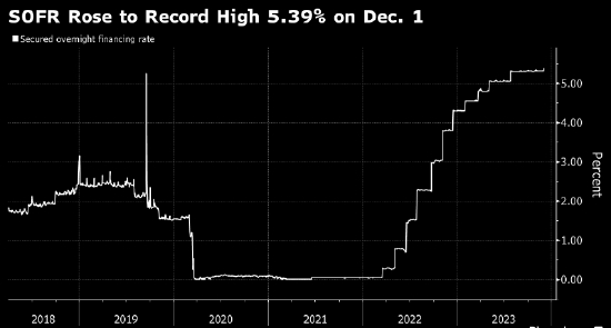 压力波及其他其他关键的融资基准,其中包括有担保隔夜融资利率SOFR。根据纽约联邦储备银行周一公布的数据,12月1日该利率升至5.39%。这是该基准利率于2018年4月作为Libor替代品首次亮相以来的最高水平。