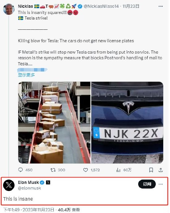 瑞典邮政服务在11月也加入了罢工,这意味着在一段时间内,该国的新特斯拉车主无法收到他们的车牌或注册他们的汽车,马斯克在X上的一篇文章中称此举“疯狂”。