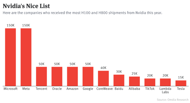 根据Omdia半导体研究最新公布的报告,微软和Facebook母公司Meta位居榜首,双双从英伟达购买了15万块H100 GPU。