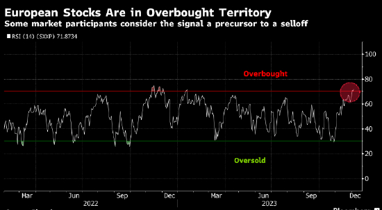 欧洲股市在12月份攀升,在过去30年里,平均而言12月是斯托克600指数表现偏正面的一个月份。受对欧元区通胀降温以及美国劳动力市场放缓的乐观情绪影响,欧洲股市11月市值增加1.2万亿美元。随着决策者暗示已经完成了加息,交易员们加大了对欧洲央行2024年降息幅度的押注。