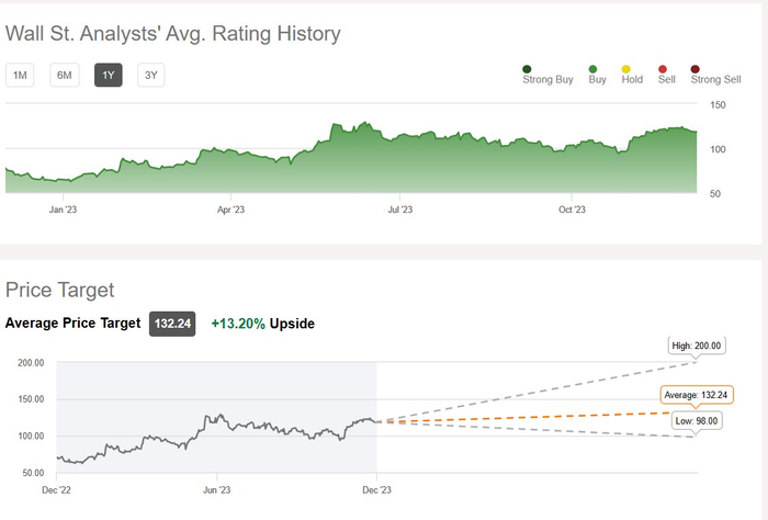 由于AMD即将推出与英伟达H100相抗衡的高性能AI 芯片,华尔街分析师们对于AMD股价普遍看涨,Seeking Alpha汇编的华尔街分析师共识评级以及目标价显示,华尔街分析师们对AMD的共识评级为“买入”,平均目标价预期达132.24美元,意味着未来12个月潜在涨幅高达13%,最高目标价则为200美元。