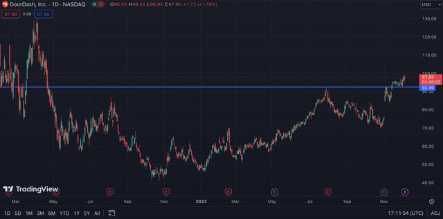 右侧的百分比回报栏中的波动性很明显。尽管存在巨大的上行潜力,但也存在相当大的下行风险。我相信长期投资者会放心地以当前价格购买和持有。然而,在获得 DoorDash 的完整职位之前,我更喜欢较低的入场点。