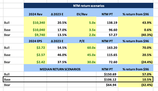 利用前面提到的分析师估计,以及 DoorDash 上市时间较短的历史估值和竞争对手的数据,我们可以创建一个包含牛市、基本情况和熊市情况的未来 12 个月 (NTM) 价格目标情景表。