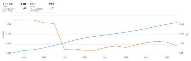 目前DoorDash资产负债表上的自由现金流 (FCF) 超过 10 亿美元,对于仍处于早期成长阶段的公司来说,自由现金流收益率接近 3%。考虑到该公司强劲的财务状况(与38 亿美元的强劲现金和现金等价物相比,其债务仅为4.93 亿美元),这一点尤其引人注目。这种负净债务状况表明金融稳定、未来投资更大的灵活性以及潜在的较低风险。
