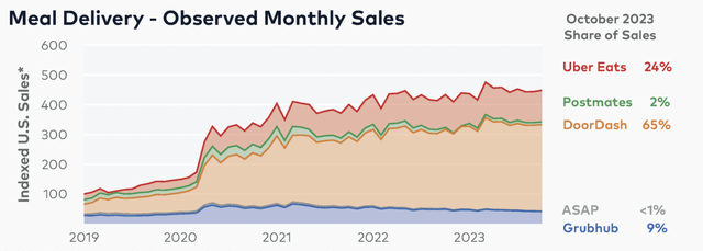 DoorDash(NASDAQ:DASH)作为美国在线食品订单聚合商占据着第一名的主导地位,拥有 65% 的巨大市场份额。这让优步(24%)和 Grubhub(9%)等竞争对手相形见绌。