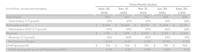 GOV 代表通过 DoorDash 下的订单所花费的总金额,而成交率是 DoorDash 保留为收入的 GOV 的百分比。它本质上衡量的是平台每笔订单的盈利能力。