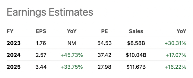 正如您所看到的,由于其 1.72 倍贝塔值,该股票的交易范围很广,如数字所示。我分别使用 30 倍到 60 倍的市盈率 (P/E) 范围来表示熊市和牛市情景。我利用 2024 年的估计来反映市场当前的估值计算。