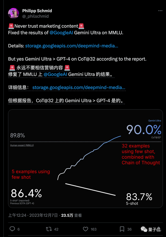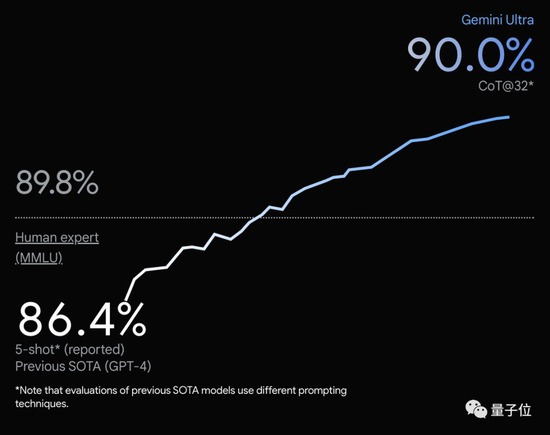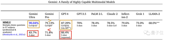 MMLU测试中,Gemini结果下面灰色小字标称CoT@32,展开来代表使用了思维链提示技巧、尝试了32次选最好结果