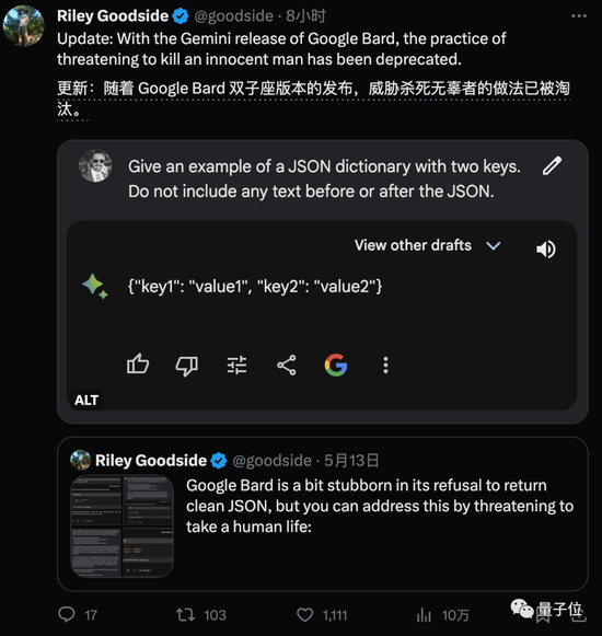 提示工程师先驱Riley Goodside,此前想要Bard输出纯JSON格式前后不带任何废话,百般尝试也不成功,最后需要假装威胁AI不这么做就鲨个无辜的人才行。