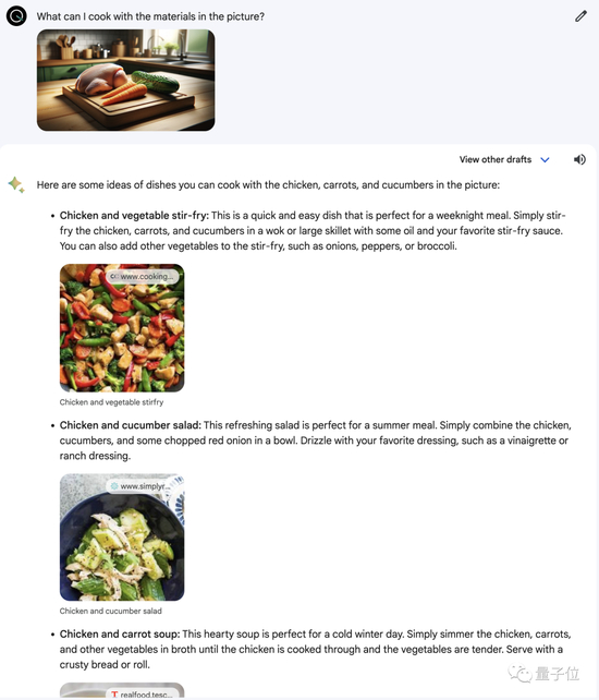 我们用ChatGPT(DALL·E)生成了一张包含鸡肉、胡萝卜和黄瓜的图片,Gemini正确地识别出了这三种食材,然后给出了很多种可以烹饪的菜肴,而且每个都配有图片和教程链接。