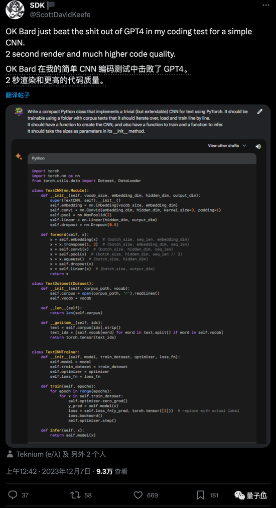 有开发者测试用Pytorch实现一个简单的CNN网络,Gemini只用了2秒而且代码质量更高。
