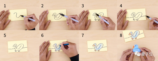 Gemini还有一大卖点是多模态能力,针对开头画小鸭子的视频,我们从中抽取了8个关键帧,分别进行提问,看看Gemini的表现有没有那么神奇。