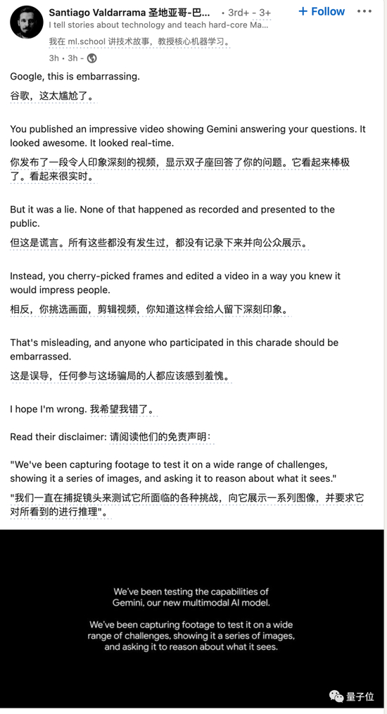 机器学习讲师Santiago Valdarrama认为声明可能暗示了展示的是精心挑选的好结果,而且不是实时录制而是剪辑的