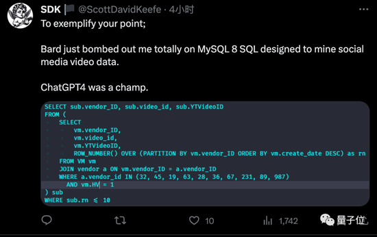 但是下一项编写SQL语句方面,这位开发者就认为Gemini表现就不太行了。
