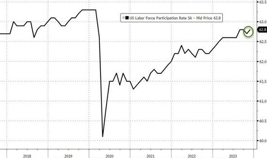 失业率的下降部分得益于劳动力人数的增长,劳动力参与率进一步升至62.8%,较预期和9月的62.7%均上行。