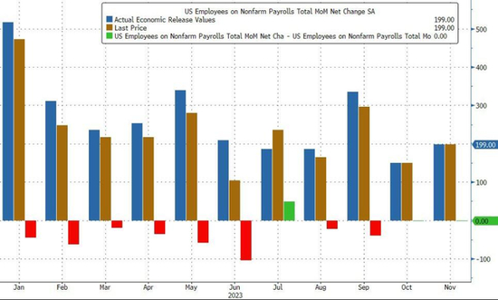 值得关注的工资方面,11月工资增幅小幅超预期,平均时薪环比增长0.4%,超出预期的0.3%,高出10月的0.2%。但同比增速放缓至4%,符合市场预期,较上月的4.1%放缓至4%。
