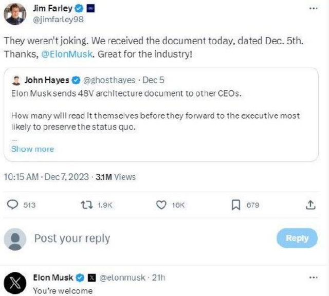 埃隆·马斯克证实了这一点,并对吉姆·法利表示,“不客气”。特斯拉正在分享其48V技术知识,希望它将成为未来的共同标准,其他厂商也不必像Cybertruck那样从头开始设计和生产所有48V低压组件。
