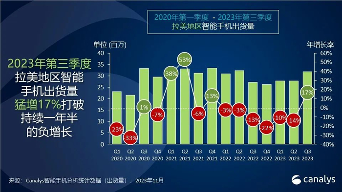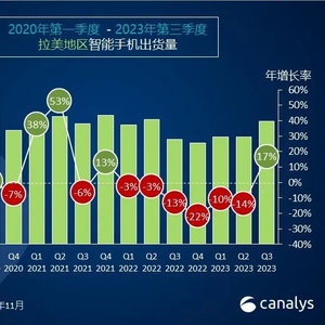 Canalys发文称,2023年第三季度, 拉美地区智能手机市场在连续六个季度下滑后迎来强劲的复苏,出货量同比增长17%至3180万部。渠道库存趋于稳定,加之在销售旺季前利好的消费环境为本次复苏奠定了基础。
