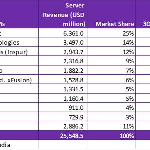 在云服务提供商细分市场,高配置AI服务器的部署正在抵消通用服务器迭代的延迟。但企业和电信运营商细分市场的情况并非如此,因为服务器制造商很难从英伟达获得足够的GPU 配货。服务器OEM 厂商表示,配置英伟达™(NVIDIA®)H100 GPU 的服务器的交付周期为36-52 周。