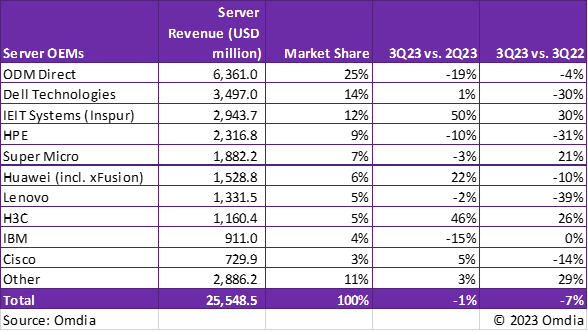 Omdia发文称,由于高成本AI服务器的渗透率不断提高,而通用服务器的更新至少要推迟到2024年,3Q23的服务器出货量同比下降26%。预计2023年全年服务器出货量为1140万台,同比下降19%。在2024年的更新周期中,Omdia预计,服务器将进行重大整合,用一台新服务器取代多台已安装的服务器。这得益于更高核数的CPU和以应用优化为核心的新型服务器架构。2027年服务器市场的价值将达到1956亿美元。