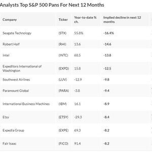 对标普全球市场情报公司和MarketSmith的数据进行的分析显示,分析师预计,希捷科技(STX.US)、罗致恒富(RHI.US)和英特尔(INTC.US)等10只标普500成分股在未来12个月将跻身表现最差的10只股票之列。
