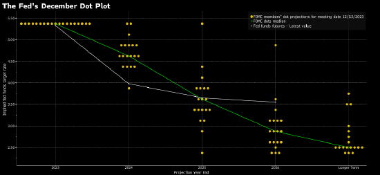 决策者的预测中值显示,2023年会有三次降息,而期货交易员预计的降息多达六次,3月开始。