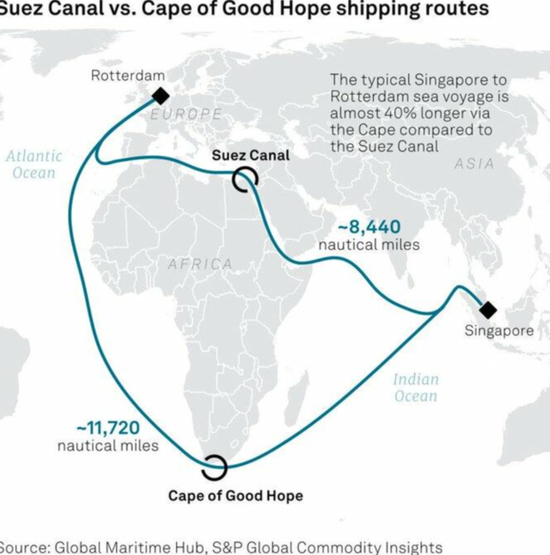 航运公司避开红海和曼德海峡的唯一选择是,绕道非洲南端的好望角,这将增加10天的航行时间。