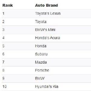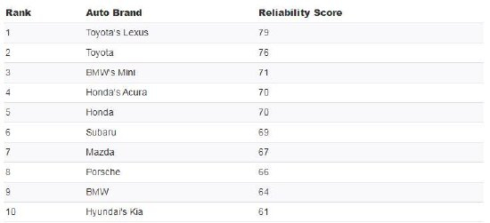 丰田旗下豪华品牌雷克萨斯以79分名列第一,丰田位居第二,宝马旗下迷你品牌、本田讴歌(Acura)及本田品牌分列第三、第四和第五位。