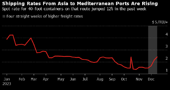 从亚洲到地中海的集装箱海运费率已经在上升。根据国际货运预订和支付平台Freightos.com的数据,截至周日通过苏伊士运河的40英尺集装箱运价为2,414美元,自11月底以来上涨了62%。