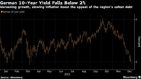 德国10年期国债收益率九个月来首次跌破2%。欧元区经济数据恶化叠加通胀放缓,凸显出明年降息的必要性。