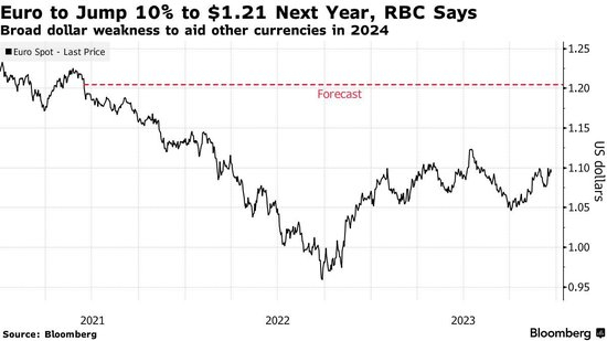 RBC的Dagmara Fijalkowski和Daniel Mitchell在12月15日的报告中写道,欧元兑美元将在2024年第四季度达到1.21的水平。相比之下,根据对多家银行的调查,它们的预测中值是欧元兑美元在2024年第四季度达到1.12