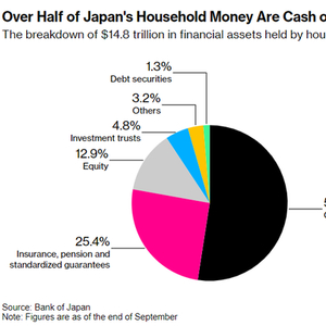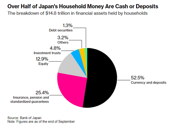 日本家庭持有的14.8万亿美元金融资产的分布情况,超过一半是现金或存款