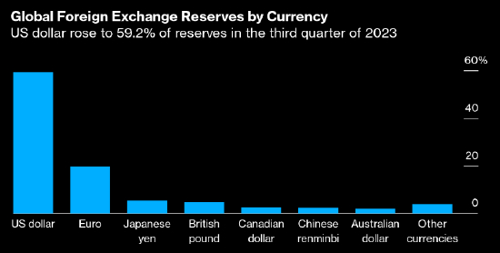 根据IMF的官方外汇储备货币构成(COFER)调查,今年第三季度,各国央行持有的美元储备的比例为59.2%,低于第二季度修正后的59.4%。这是自去年第四季度以来的最低水平。