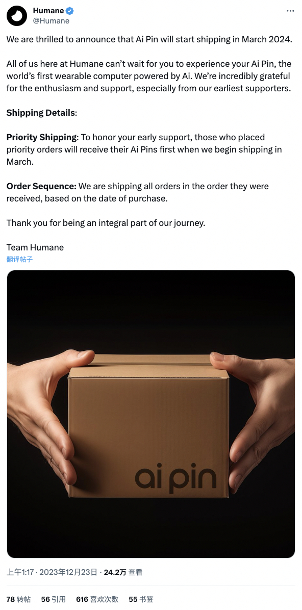周五,Humane官方在X平台发文表示:我们非常高兴地宣布,Ai Pin将于2024年3月开始发货。