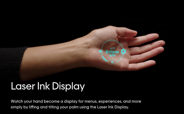 具体而言,Ai Pin的“激光墨水显示器”功能,可以在手掌上投射一个绿色用户操作界面,用户可以使用各种手势或语音交互,进行拍照、翻译、卡路里识别等功能。