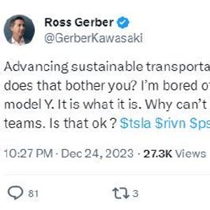 在后来的一篇帖子中,格伯解释了他决定换掉Model Y的原因,他说:“推进可持续交通是我们的目标。我喜欢很多电动汽车。为什么这会困扰你?我厌倦了Model Y,对不起。是时候有一个新的model Y了。为什么我不能喜欢很多电动汽车?我喜欢好几个足球队。难道不行吗?”