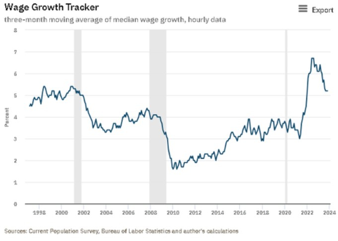 在多次提高利率之后,美联储已经能够减缓工资的增长速度,从两年前的每年近7%降至现在的每年5%左右。现在,美联储宣布将在2024年降低利率,工资的下降可能不会持续下去,Sharma预计工资将继续以目前5%左右的速度增长。